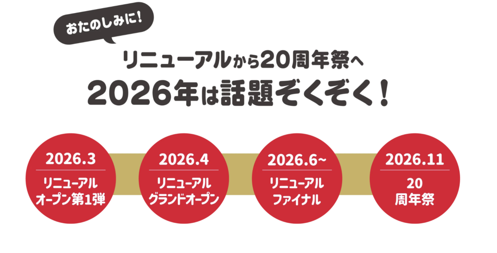 リニューアルオープン第一弾が2023年3月にあり、グランドオープンは2026年4月。その後、2026年6月からファイナルにさしかかり、11月には「20周年祭」が予定されています。