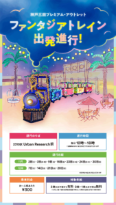 神戸三田プレミアム・アウトレット内の2310区 Urban Research前を運行するカントリートレインです。お一人様300円で乗車でき、2歳以上のお子様から有料となります。雨天時は中止となる可能性があるためご注意ください。クリスマスシーズンのお買い物と合わせて、お子様と楽しめるアトラクションです。