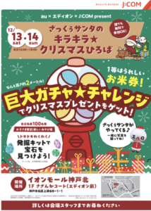 イオンモール神戸北に、ざっくぅサンタがやってくるクリスマスイベントです。高さ約2メートルの巨大ガチャにチャレンジして、お米券やクリスマス賞品をゲットできます。さらに、各日先着100名のお子様限定で宝石発掘体験も開催。家族で楽しめる体験が満載です。