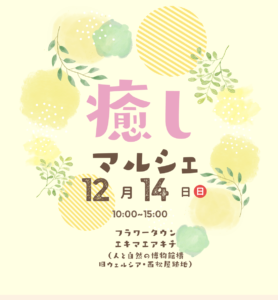 郷の音ホールでは、13日・14日と両日クリスマスコンサートが開催されます。また、エキマエアキチでは日頃の疲れを癒す「癒しマルシェ」(14日)が開かれます。