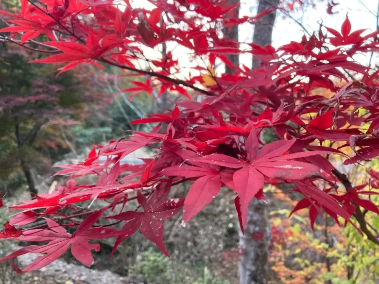 2022年11月7日に訪れた際はまだ青々としたもみじが目立ち、色づきはじめでしたが、11月24日には見頃ピーク直後で、真っ赤なモミジが迎えてくれました。見頃を少し過ぎた「しなびた感じもおもむきがあって楽しめた」という読者さんの声もありますよ。