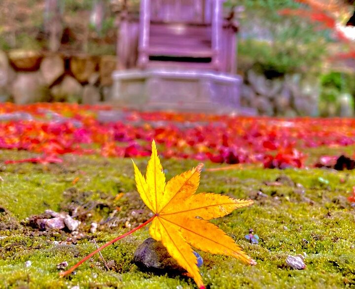本堂へ向かう参道のモミジは本当に見事。特に早朝の、まだ空気が冷たい時間帯に、境内を包む霧の向こうから朝日が差し込む瞬間は、まるで小説の挿絵を見ているような、非現実的な美しさでした。モミジの赤が、苔の緑と瓦の黒に映えて、息をするのを忘れるほどでしたよ!