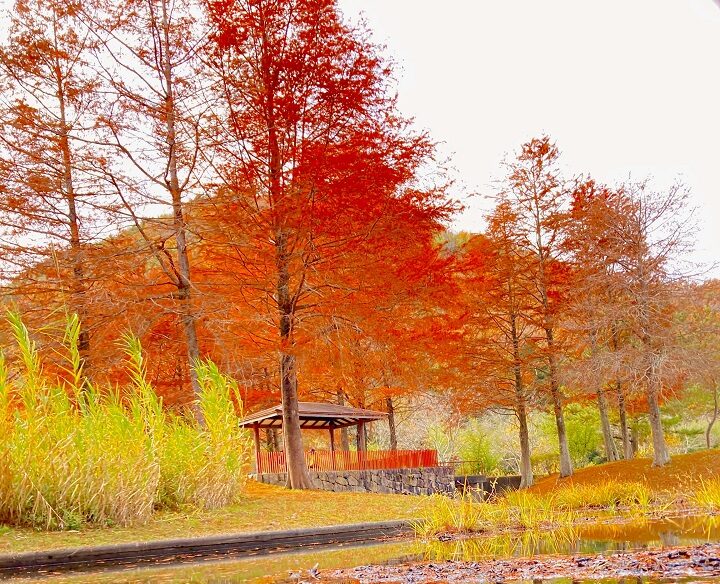 ここでの見どころは、モミジやイチョウだけではありません。なんといっても、ラクショウ(落羽松)という大きな木の紅葉が独特で美しいんです!2022年11月24日に訪れた際は、すでに地面一面が落ち葉の真っ赤な絨毯になっていて、モミジとは違う、シックで美しい景色に感動しました。