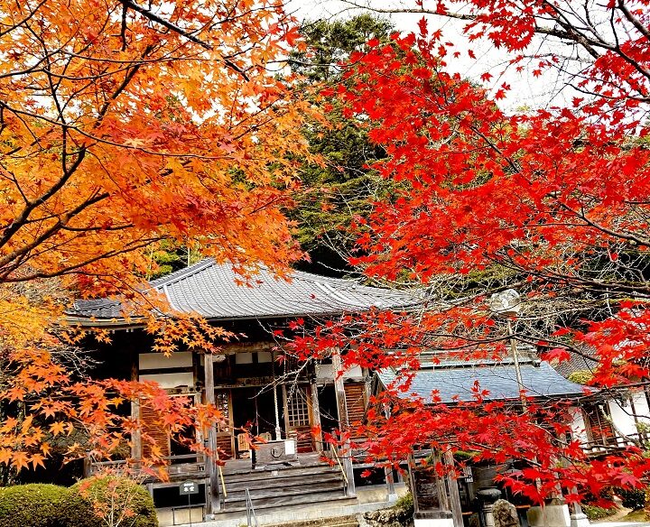本堂へ向かう参道のモミジは本当に見事。特に早朝の、まだ空気が冷たい時間帯に、境内を包む霧の向こうから朝日が差し込む瞬間は、まるで小説の挿絵を見ているような、非現実的な美しさでした。モミジの赤が、苔の緑と瓦の黒に映えて、息をするのを忘れるほどでしたよ!