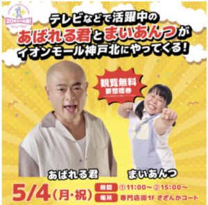テレビで大人気のあばれる君とまいあんつが、イオンモール神戸北リニューアルを記念してやってきます!観覧無料(整理券制)の2ステージ構成。整理券は当日9:00より専門店街1F E入口にて配布(各回80枚・計160枚)。GWの笑顔あふれる思い出に、ぜひ家族みんなで楽しんでください。