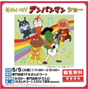 こどもの日にアンパンマンたちがイオンモール神戸北にやってきます!観覧無料で、お子さまが大好きなキャラクターを間近で楽しめるステージショー。整理券は当日9:00より専門店街1F E入口(さざんかコート)にて各回300名分配布されます。立ち見は整理券不要なので、整理券が取れなくても安心。こどもの日の思い出に家族みんなで楽しみましょう。