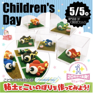こどもの日限定のワークショップ。軽量粘土を使って自分だけのオリジナルこいのぼりを作れます。完成したこいのぼりは透明ケースに入れて持ち帰れるので、素敵な記念品に。定員80名・当日受付制で、Instagramフォローで参加料が半額になる特典も!小さなお子さまから楽しめる、こどもの日にぴったりの体験です。