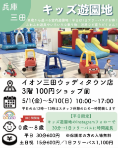 GW期間中、イオン三田ウッディタウン店3階にキッズ遊園地が登場!乗り物やアトラクションでお子さまが思いっきり遊べます。Instagramフォローで平日フリーパスが割引になるお得な特典も。雨の日のお出かけにもぴったりです。