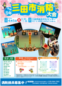 三田市の安心・安全を支える消防団による伝統行事です。迫力ある「はしご演技」の披露や消防車両の展示など、乗り物好きなお子様は大興奮間違いなし。式典の後は郷の音ホールの駐車場エリアでのアトラクションも楽しめます。