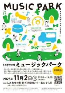 しあわせの村の芝生広場で開催される、音楽と食、遊びを楽しむ野外フェスティバルです。プロのアーティストによるライブパフォーマンスのほか、キッチンカーやマーケット、親子で楽しめるワークショップなどが予定されています。自然の中で音楽とグルメを味わいたいファミリーや若者におすすめです。
