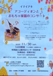 有馬富士共生センターの多目的室で開催される、イマイアキさんによる一人演奏コンサートです。アコーディオンやトイピアノ、おもちゃ楽器が織りなすユニークな演奏が楽しめます。お子様と一緒に、創造的な音楽の世界に触れたいファミリーにおすすめです。