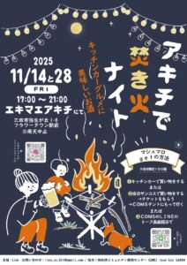 三田駅前の「エキマエアキチ」で開催される、焚き火とグルメを楽しむナイトイベントです。キッチンカーグルメや美味しいお酒、子ども縁日、ステージイベントが楽しめます。焚き火で焼きマシュマロ体験もできる、今年最後のアキチでナイトです。金曜日の夕方から夜にかけて、家族や友人と温かい焚き火を囲んで過ごしたい方におすすめです。