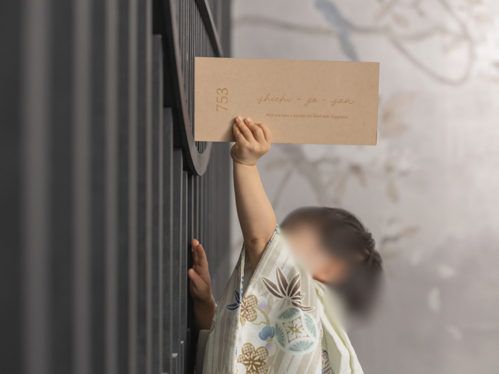 七五三の和装にぴったりの本格和室スタジオ。障子越しに入る柔らかな光と、洗練された生け花や掛け軸といった和の小物が、伝統的でありながら和モダンな雰囲気を演出してくれました。フォーマルなカットもバッチリです。