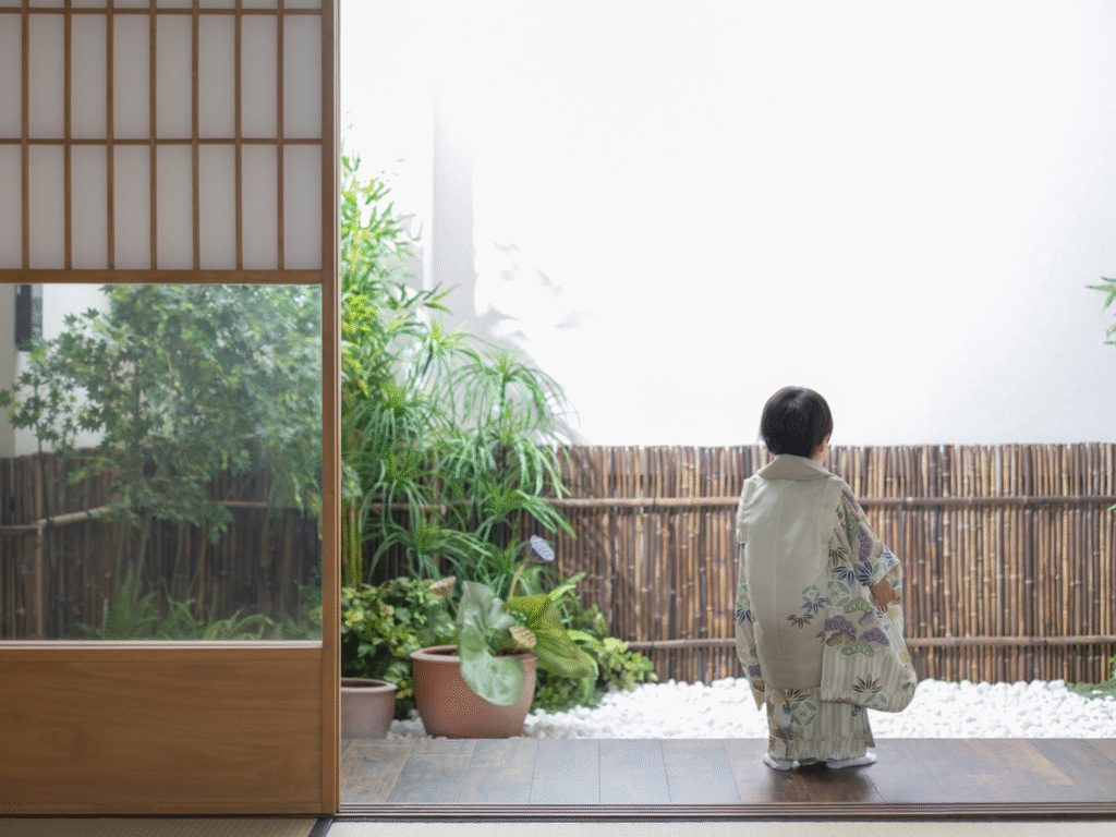大きな窓辺で、モダンな柄の和装を際立たせるクラシックな一枚を。広々とした空間のおかげで、息子も伸び伸びと。「真っ白な背景×カラフルな小物」が被写体を引き立ててくれます!