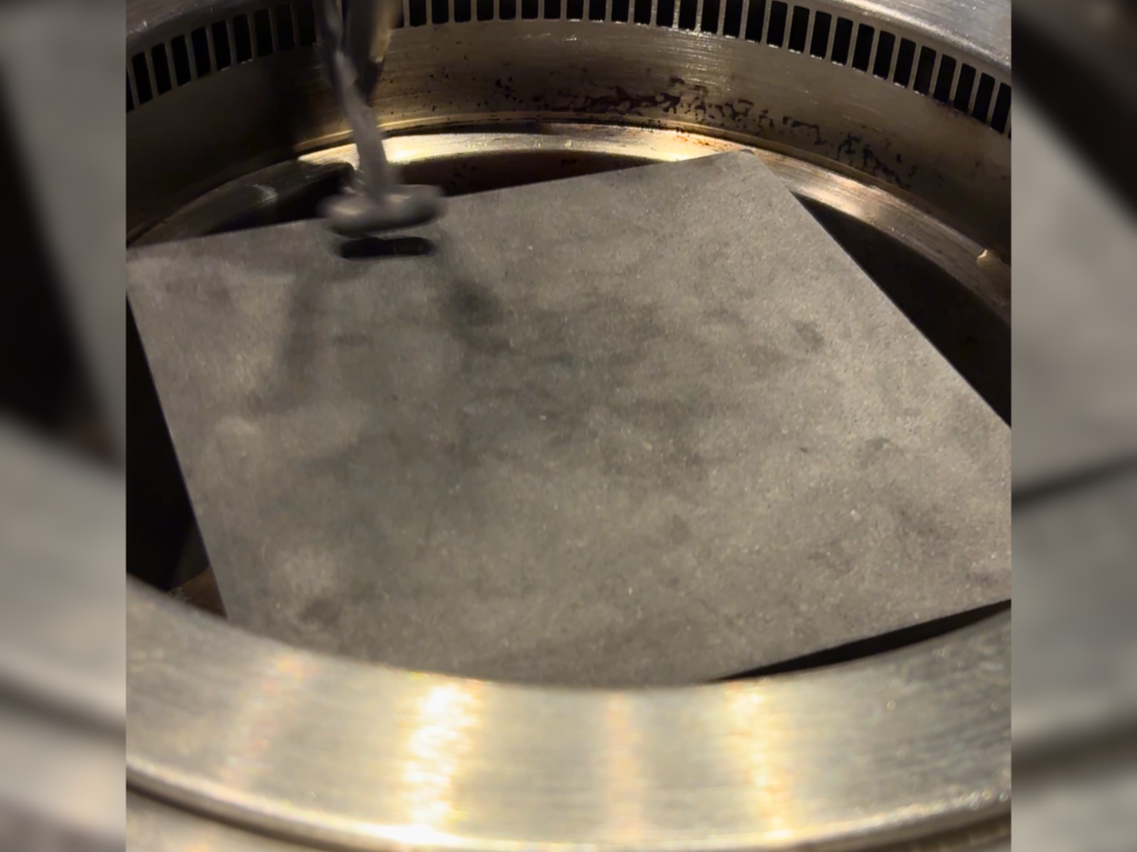 プレートに置いてしばらくすると、表面に静かな変化が現れてきます。一般的な焼肉のように「ジュー!」という激しい音はしません。もっとゆっくりで、じわじわした変化です。