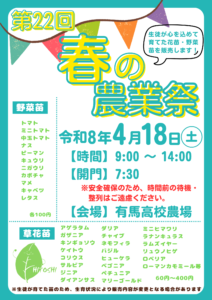 有馬高校の生徒たちが丹精込めて育てた野菜や草花の苗が驚きの価格で販売される、三田の春の風物詩です。毎年早朝から行列ができるほど人気で、家庭菜園を始める方にぴったりのイベントです。